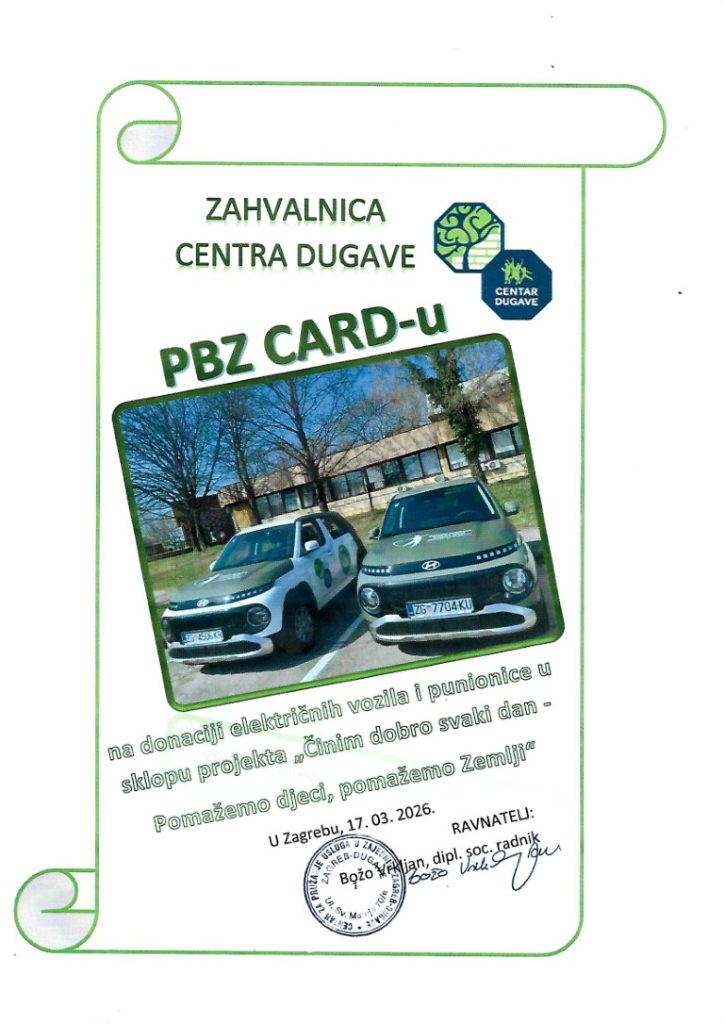 Zahvalnica Centra Dugave PBZ CARD-u na donaciji električnih vozila i punionice u sklopu projekta “Činim dobro svaki dan – Pomažemo djeci, pomažemo Zemlji”.